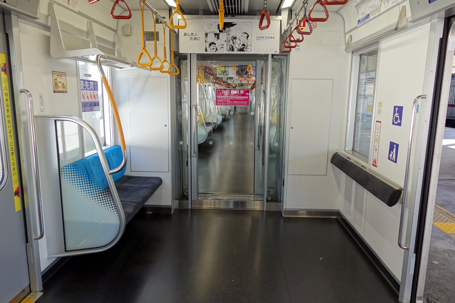 車端部は優先席とフリースペースが設けられています。フリースペースには腰掛けが設けられていて、短距離移動の際などには便利ですね。