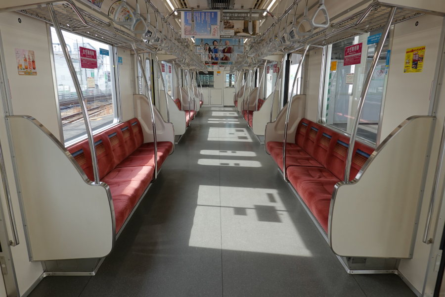 車端部は4人掛けで2+2人掛けに分割されています。つり革と握り棒はオレンジ色となっています。
