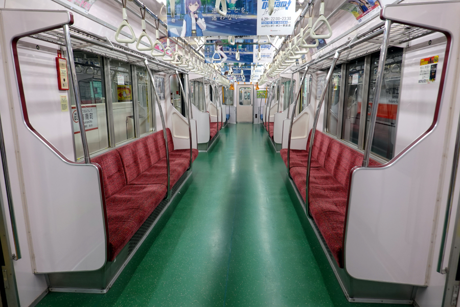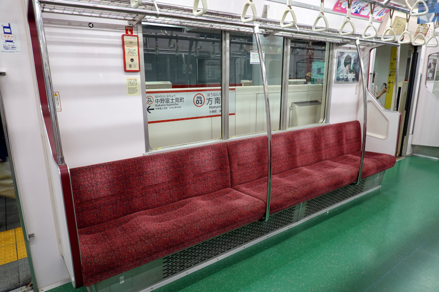 前述したB修工事を受けて内装は大きく変化しました。南北線9000系のB修工事車と雰囲気が似ています。床面はラインカラー完全無視で緑一色です。