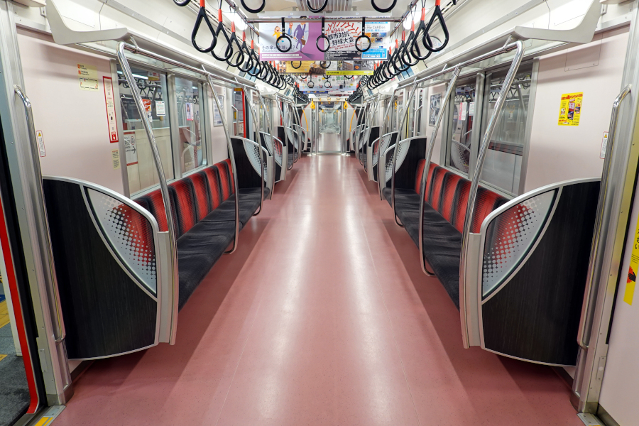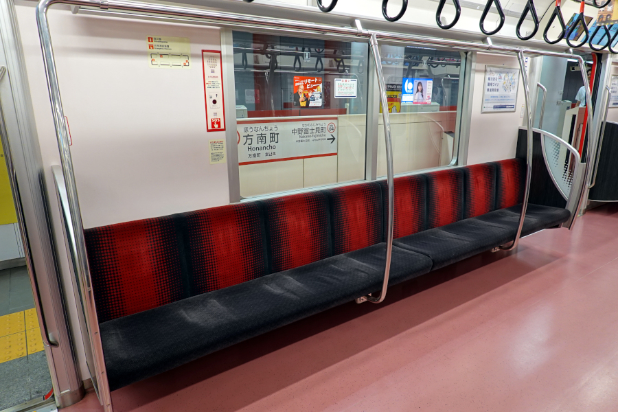 従来車両と同じく座席は握り棒で3+3+2に分割された変則的な形態です。座席はバケットタイプで、ラインカラーである赤色で着席区分が示されています。