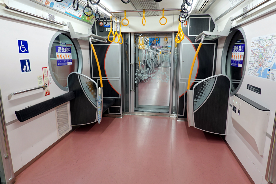 車内は黒とラインカラーの赤でまとめられていて落ち着きのある雰囲気です。つり革は水滴のような独特な形状となっています。