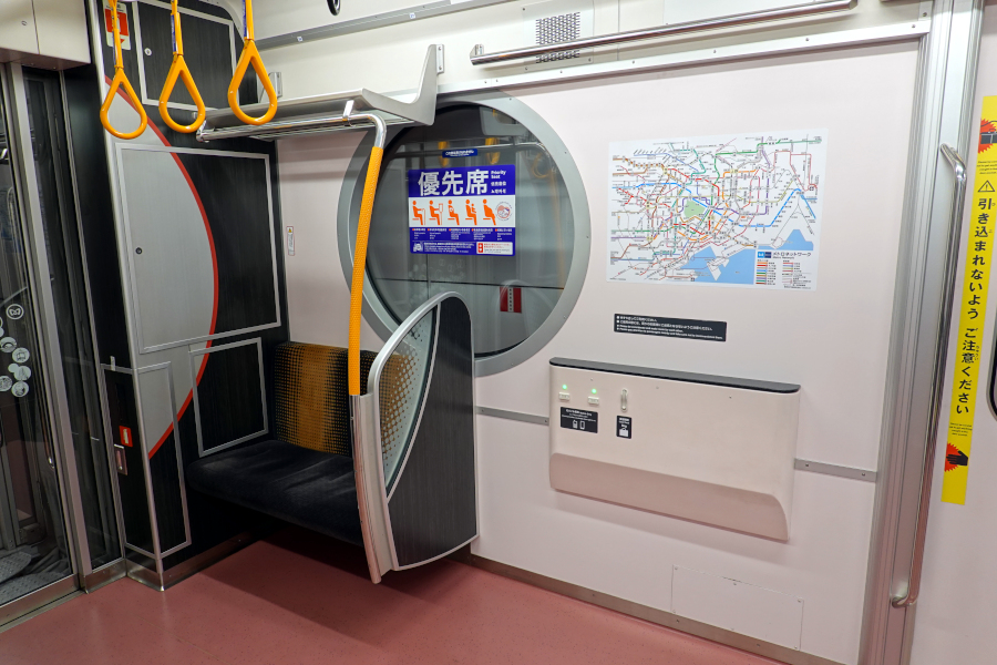 本形式の最も特徴的なのだ車端部です。車端部には優先席とフリースペースが設けられています。妻面は丸をイメージしたデザインが施されています。左のフリースペースには腰当てが設けられているのが立客にとって嬉しいですね。