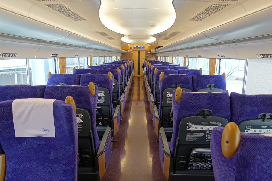 座席は江戸紫のモケットになっており、座り心地はやや硬めです。背面には大型テーブルやドリンクホルダーが備えられていて、肘掛け側面にはコンセントもあります。また肘掛けには内蔵テーブルもありますが、サイズが小さくて使い勝手は悪そうです。