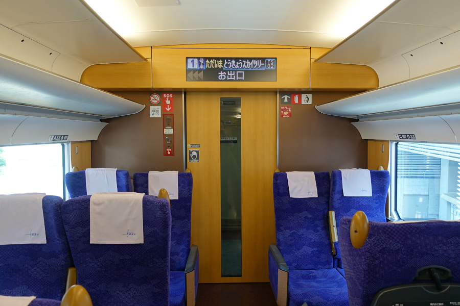 東京スカイツリーをイメージさせる白を基調としており、部分的に木目調を取り入れています。明るい雰囲気の天井は間接照明となっていて、隅田川や鬼怒川をイメージした波型のデザインになっています。