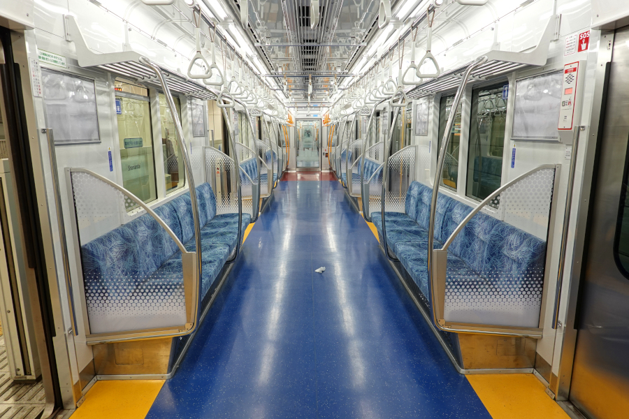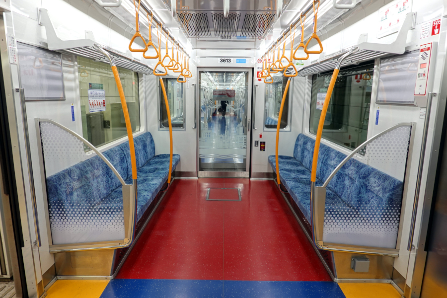 優先席がある場合はつり革・握り棒・床面の色で区分しています。ただ伝統的?に座席モケットの色は頑なに変えませんね。側窓は大きな1枚窓で、妻窓やガラス1枚板の貫通扉などで開放感があります。