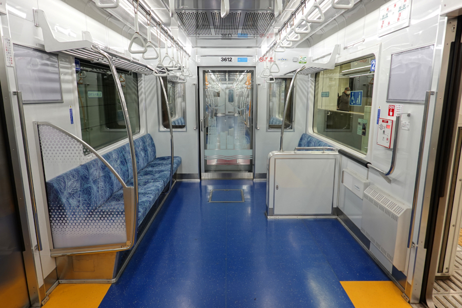 車内はかなり大型の袖仕切りがガラス製なので開放感があります。既存車は暖色系となっていましたが、3000V形では一転して寒色系で爽やかな雰囲気です。