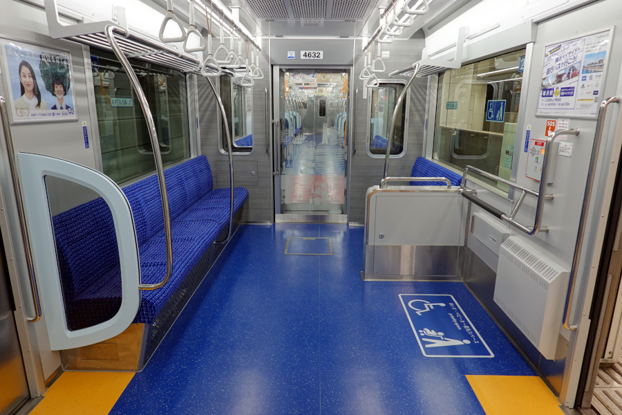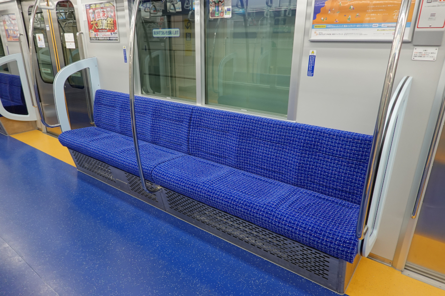 内装は濃い青系統の色で、ドア付近の黄色い床面が目立ちます。袖仕切りは幅が若干狭まりましたが大きさは十分です。