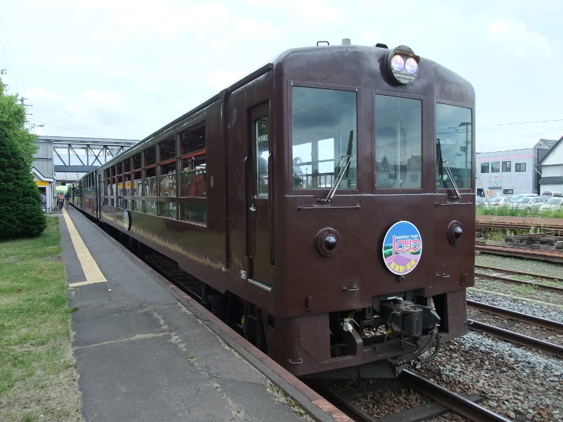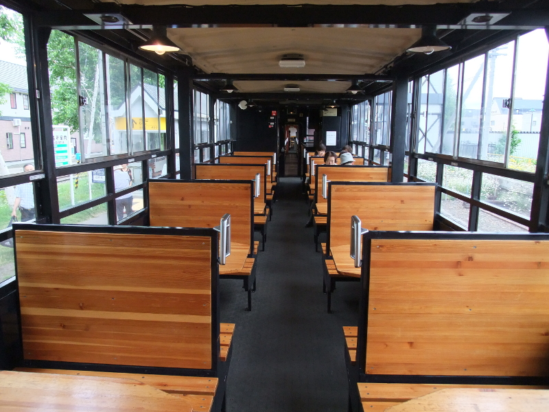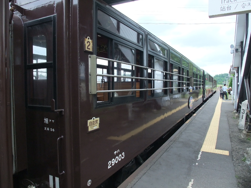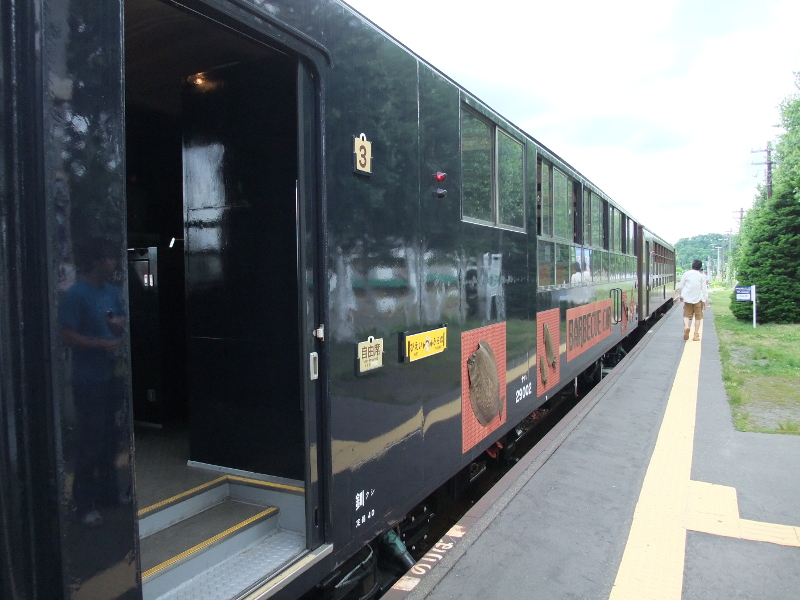 富良野・美瑛ノロッコ号の特長は客車の種類が豊富な事です。こちらは追加改造された車両で、何と貨車からの改造車です。車両に扉が設けられていないので、前後の車両から乗り込む形になります。