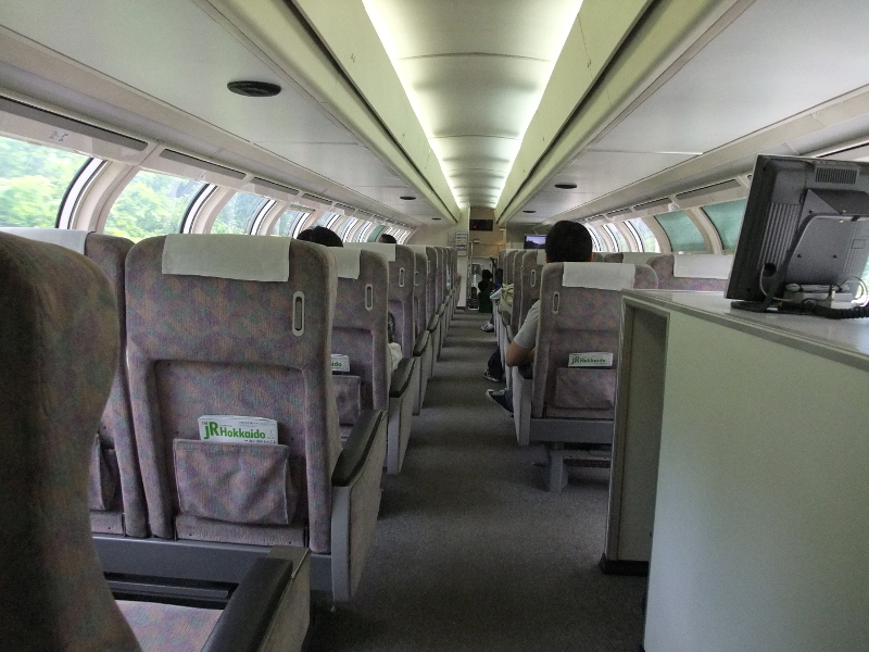 車内はハイデッカー構造になっていて、窓は天井近くまで達しています。まるで景色に包み込まれるような感覚で、北海道のリゾート列車のレベルの高さを実感します。天井から吊り下げられているモニタでは全面展望を映し出しています。
