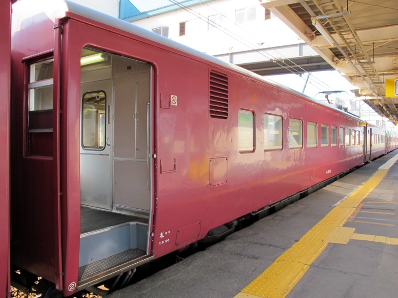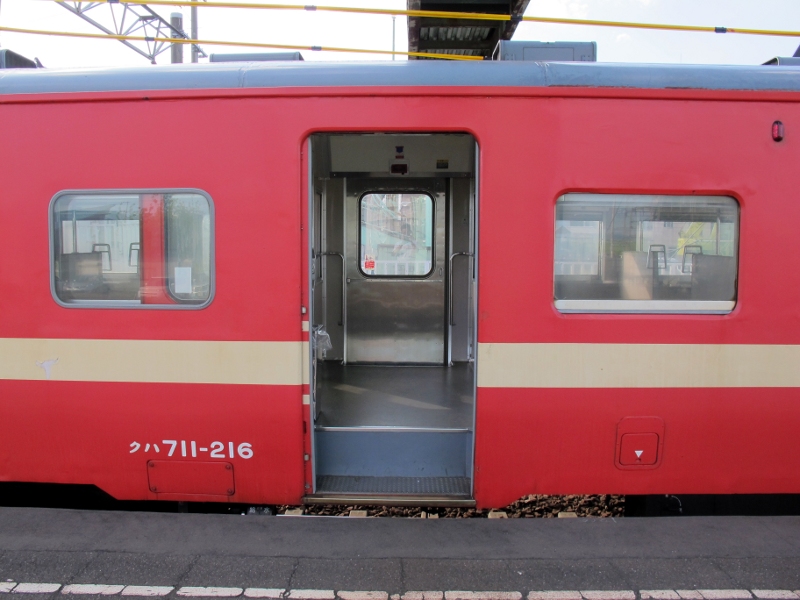 車端に片開きのドアにデッキ付き、と急行型を彷彿とさせる構成になっています。ドアの横に大きめのルーバーが設けられていますが、これはモーター等の冷却風を取り込むためのものです。雪と分離する機能があるので雪切室と呼ばれます。