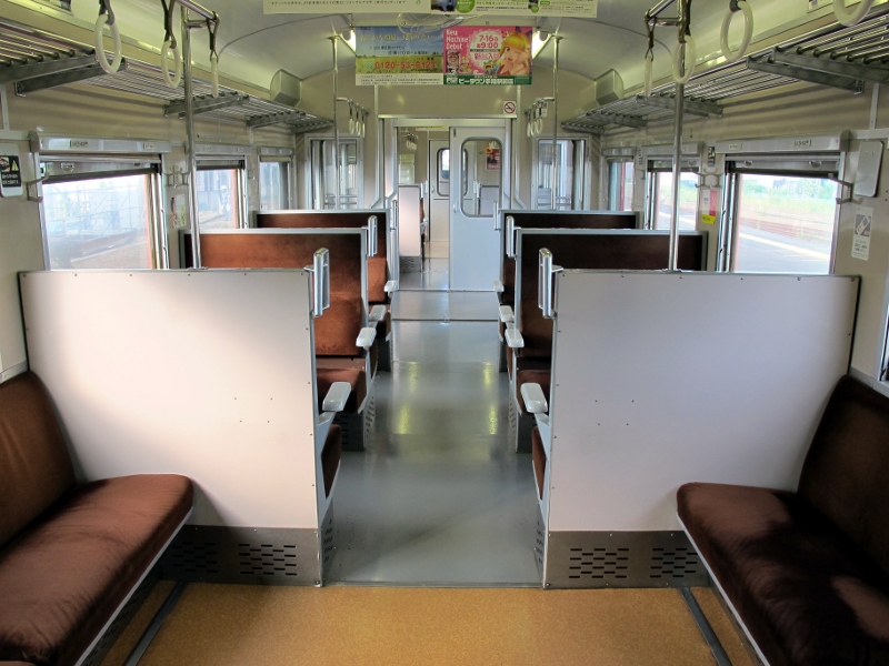 車内は車端部ロングのセミクロスシートになっています。窓は車内保温のために二重窓になっています。かつては急行運用に就いたこともあるそうです。車端部を除けば雰囲気は本州の急行型とほとんど変わらないので、これでも問題無かったのかもしれません。