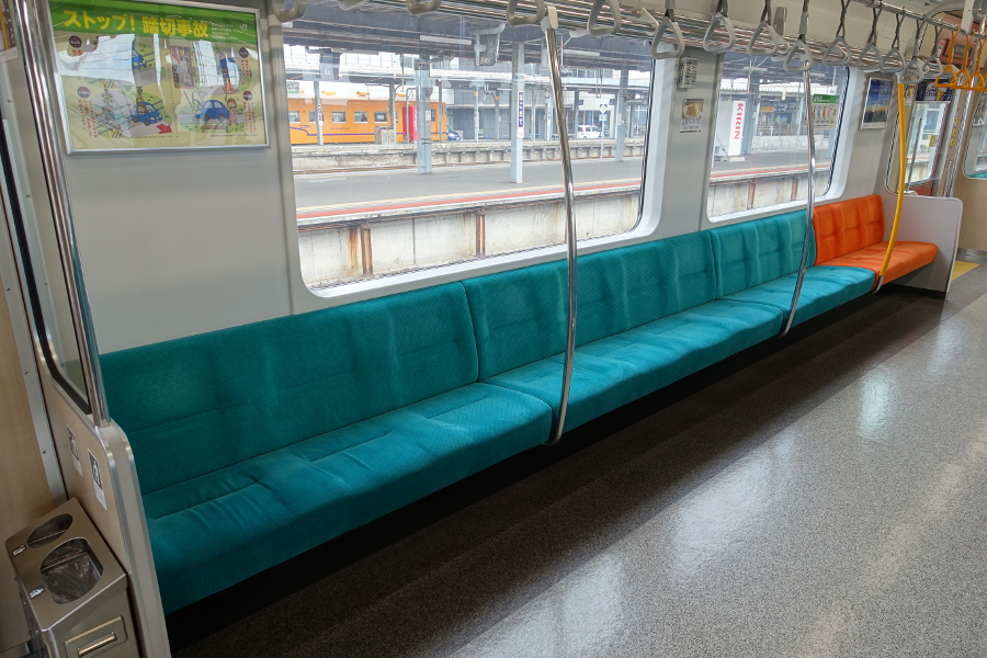 ロングシートは3+4+3+3という独特な席数で分割されています。一般席は青緑色、優先席はオレンジ色になっています。座り心地は程良い固さで20分程度の乗車時間では全く苦になりません。