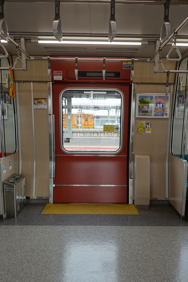 車端部にはデッドスペースが出来ていますが、ゴミ箱・消火器・懐中電灯・非常通報機などが設けられてスペースを無駄なく利用しています。繁忙期には立席スペースとして活躍するでしょう。