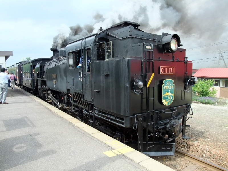 私が乗車した日の牽引機はC11-171号機でした。ヘッドマークがオシャレで格好良いですね。蒸気機関車としては小柄ながらも近づいたときに感じる熱気は迫力があります。なお函館行きの復路は転車台だ無いのでバック運転になります。これは連結前に撮影したものです。