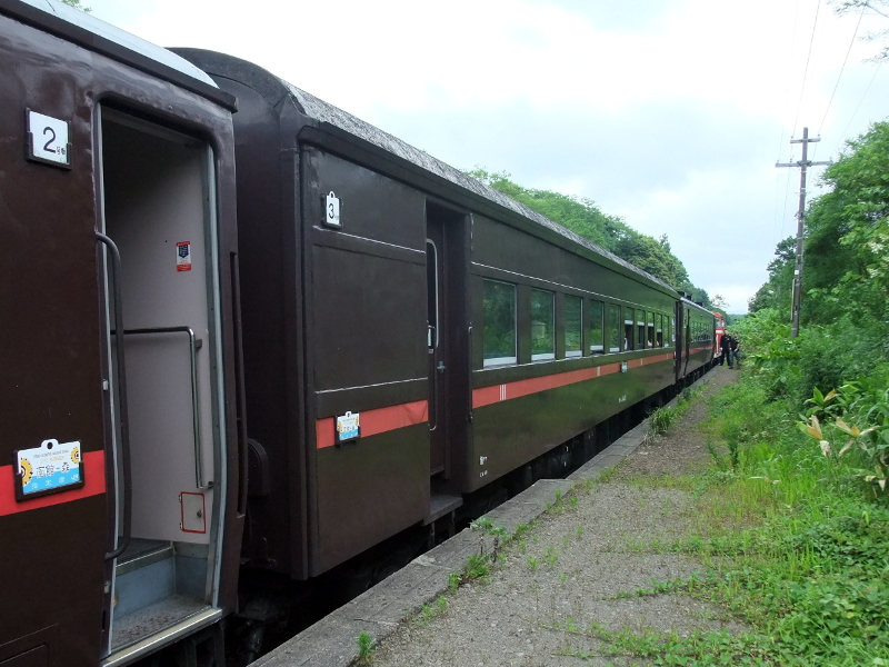 SL函館大沼号の客車は14系客車とスハ43系客車が連結されています。組成は函館方から[ヨ3500][オハ14][オハ14][スハシ44][スハフ14]です。14系は編成中程に連結されている旧型客車に合わせて茶色に赤帯で塗装されています。