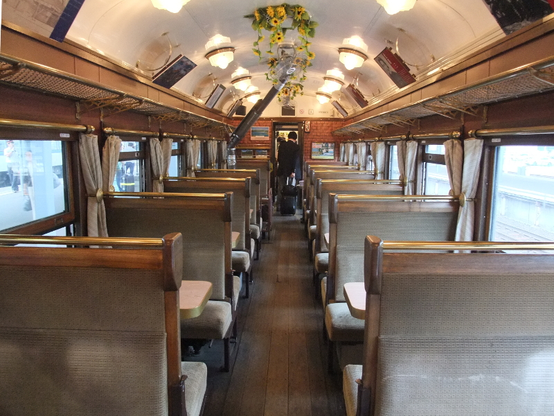 さすがは旧型客車だけあって車内もレトロな雰囲気ですね。この車両にも大型テーブルが設置されています。この車両だけは原形を維持してほしかったですが、グループ客での利用を考えたら仕方がないです。