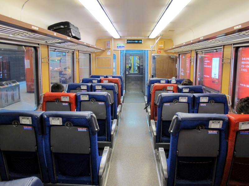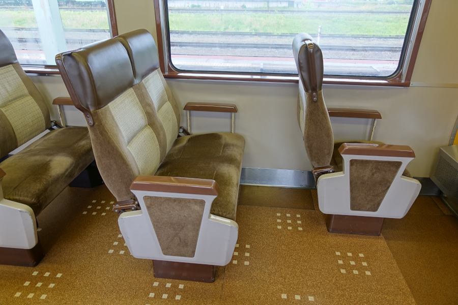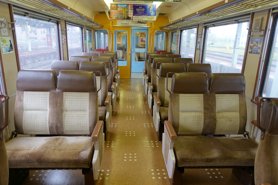 初期の車両は茶色系統の内装になっていて、座席は転換クロスシートという豪華な仕様です。デッキ付き片開き3ドアで車両中央にもデッキが設けられています。そのため車内は前後で分かれた造りになっています。