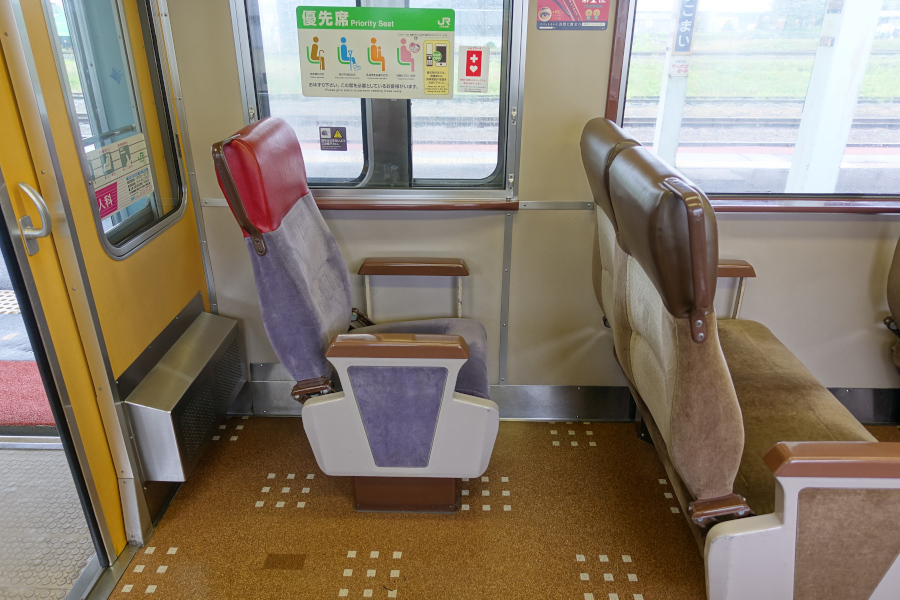 優先席はモケットを変えて区別しています。