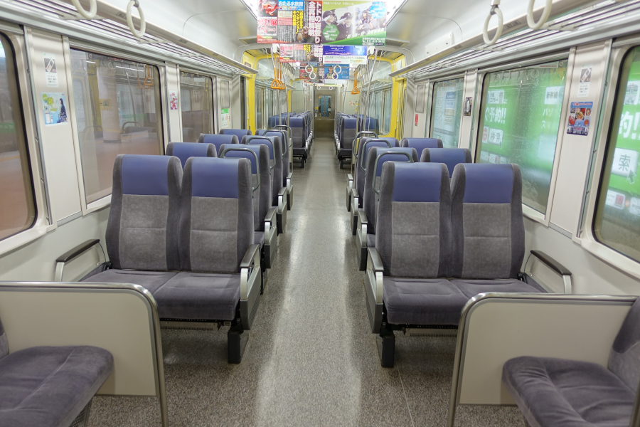 最新の8次車ではデッキを廃止すると共に白を基調とした内装に変更されて雰囲気が全く別物に変化しました。ドア付近はロングシートのセミクロスシートになり混雑対策も行われています。