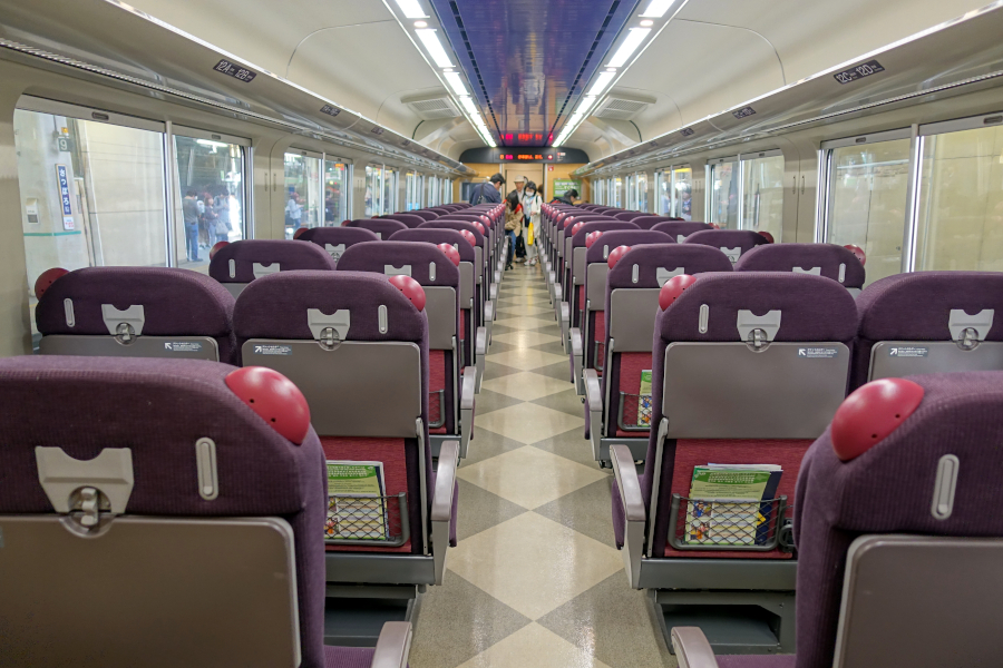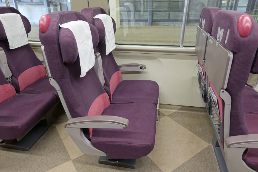 車内は紫色の派手なグレードアップ座席が並んでいます。通路天井が青色なのが爽やかさを感じさせます。全体的に明るい色調で窓も大きいので開放感があります。