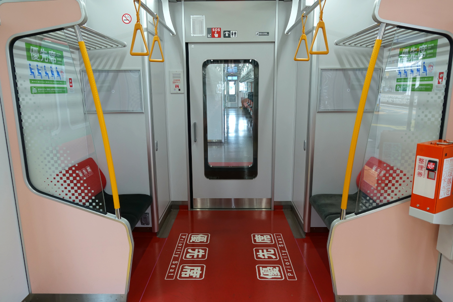 車端部は優先席となっていて、床面にデカデカと描かれています。妻面には機器室が設けられている他に側窓が無いので閉塞感があります。