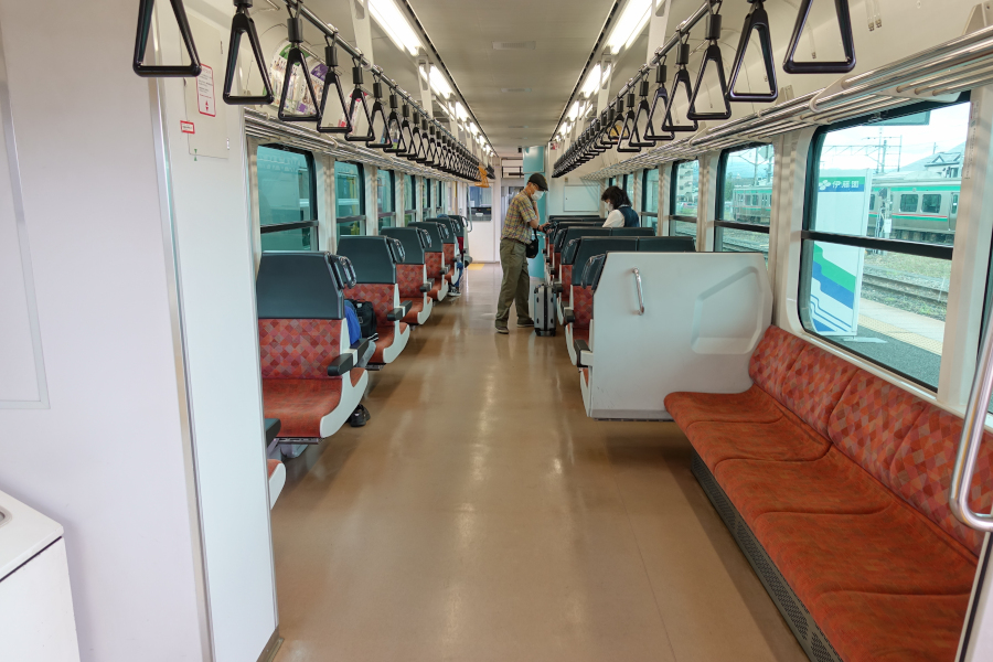 車内はドア付近がロングシートで、それ以外はボックスシートとなっています。通路幅確保のためかボックスシートは1+2列となっていて、車内はそれなりに開放感があります。
