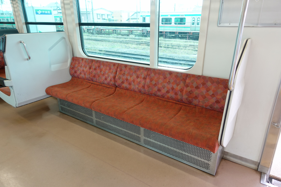 ロングシートは関東でもよく見かけるタイプで座り心地は硬めです。暖房装置が強化されているのか、座席は片持ち式ではありません。
