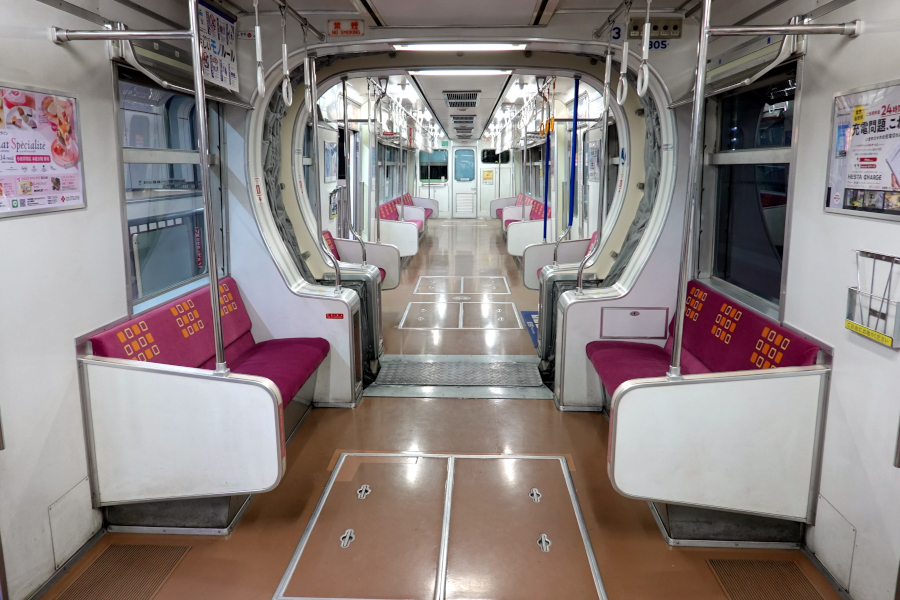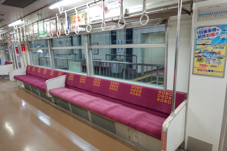 1985年の開業以来運用を続けていますが、リニューアルでも受けたのか車内は綺麗な状態です。多摩モノレールのように足回りを全て床下に設けたため、車内はフラットな床で段差はありません。