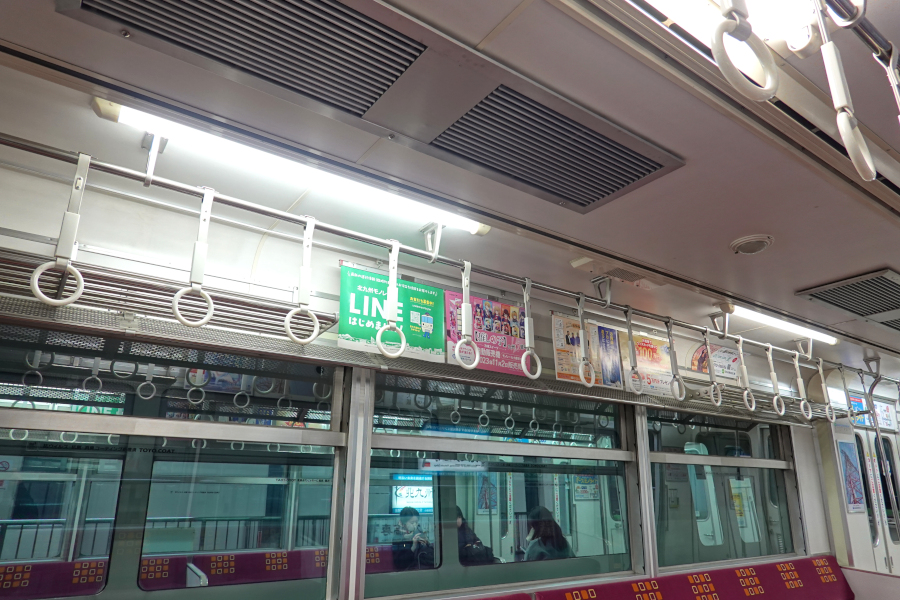 画像では見にくいですが、荷棚が途切れている部分には中づり広告が設けられています。天井高さがそこまで低いとは思わなかったですが、普通に中づり広告を設置できなかった事情でもあるのでしょうか?