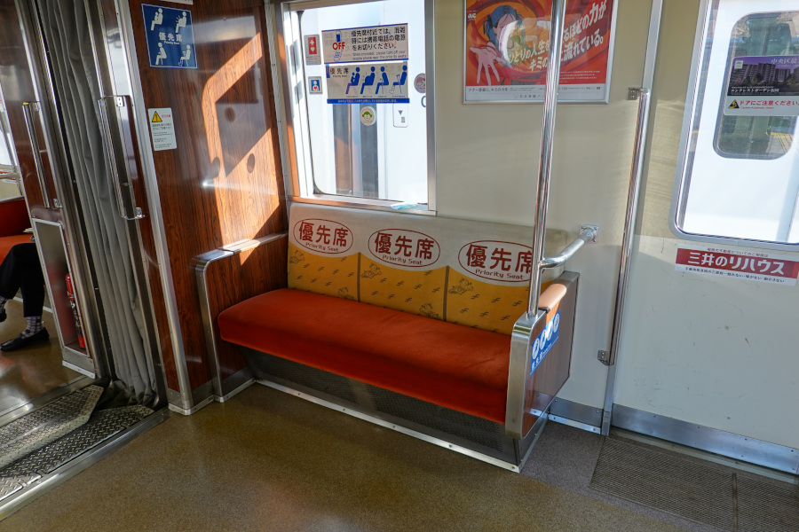 優先席は背ずりのモケットが異なり、デカデカと優先席である表記が入っています。妻面寄りを見るとひじ掛けのように出っ張っているのが特徴です。