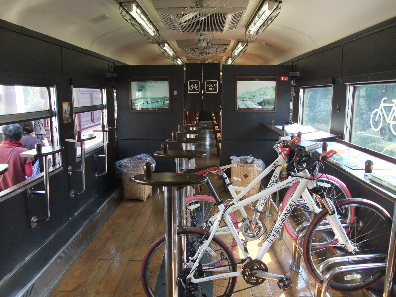 車内には自転車の積載スペースも設けられていて、乗車した当時も利用者が居ました。ここは車販基地やフリースペースも兼ねていて、窓際にはテーブルも設けられています。