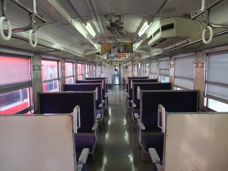車内は国鉄型としてごく一般的な内装になっています。電灯の設置間隔が広いからなのか車内が薄暗く感じます。九州はあまり内装の更新工事を行わない印象があり、この車両も冷房改造程度で内装はほとんど手を加えられていません。