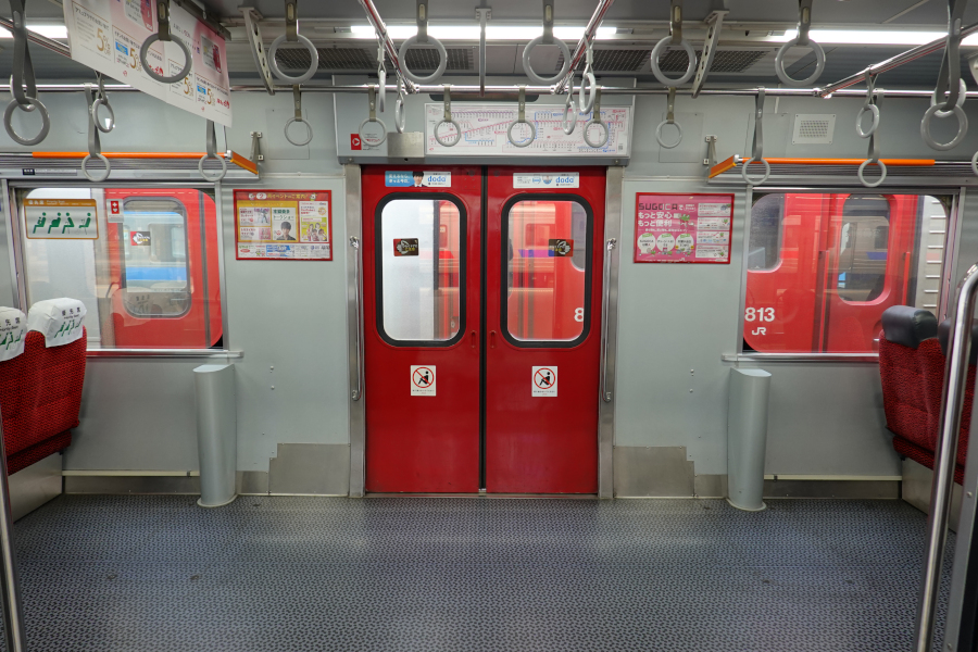 座席撤去により中央ドア付近はこのように広大なスペースが生まれています。座席撤去には多くの批判が寄せられていますが、実際に座席未撤去車に乗車したところドア付近に混雑が集中する一方で通路まで進まない乗客が多かったです。現状を鑑みると座席撤去はある程度やむを得なかった印象です。もちろんロングシート化がベストですが。