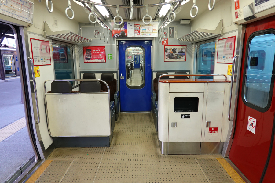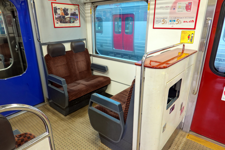 車端部は原形を留めています。福岡都市圏の混雑を見るにオールロングシートでも良さそうですが、改造が難しい箇所なのかもしれません。