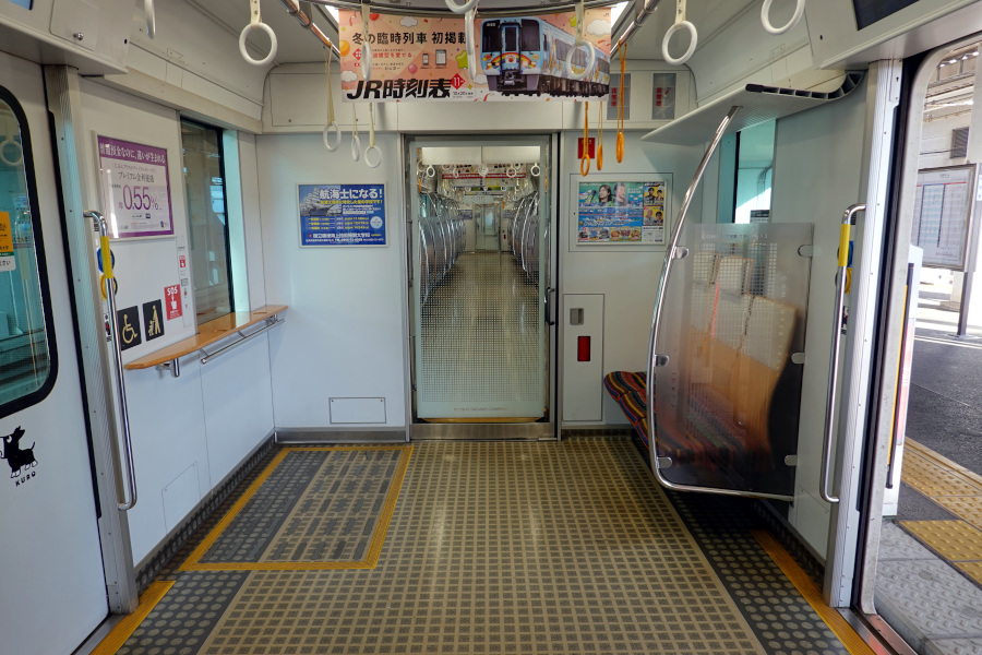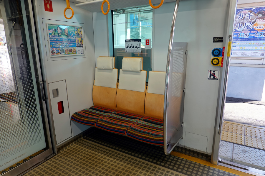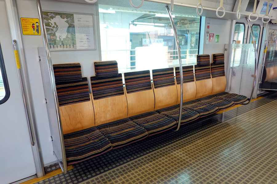 車端部には優先席とフリースペースが設けられています。黄色い枠だけだとフリースペースの存在が目立ちませんね。窓際には細長いテーブルが設けられていますが、個人的には関東で採用例のある腰掛けがあった方が喜ばれると思います。
