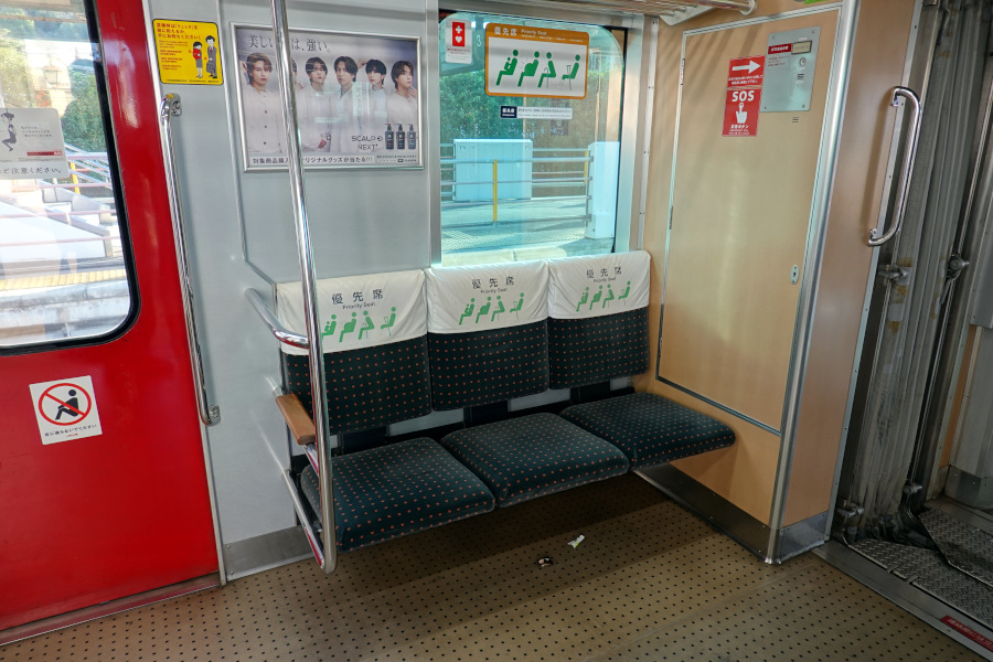 車端部は片側が優先席となっています。つり革は他の箇所と同一品です。