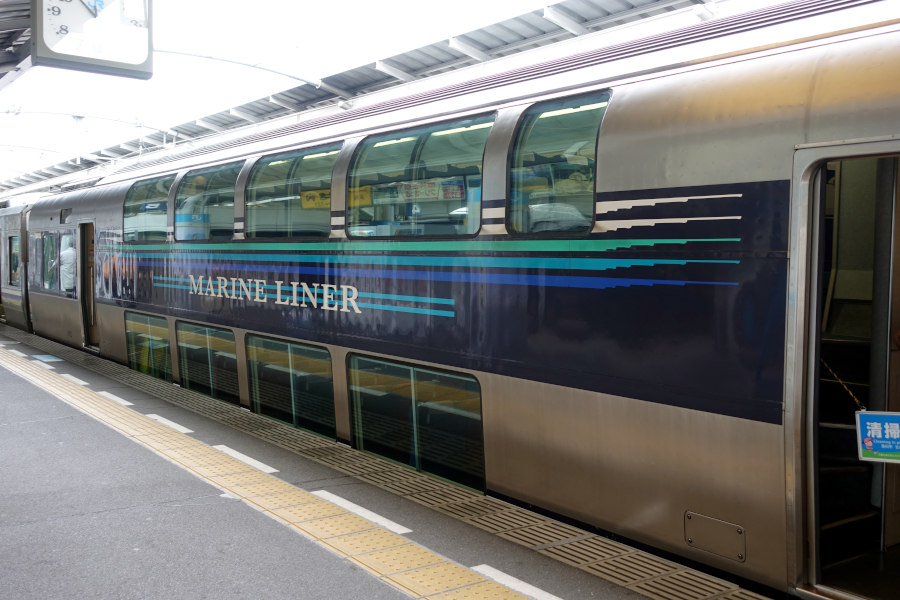 時間の関係で前面からは撮影できませんでしたが、こちらが青緑色の編成です。マリンライナーという名称からすればこちらの方が似合っている気がします。