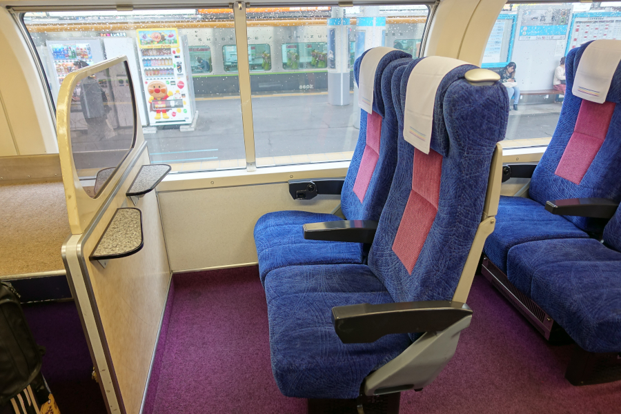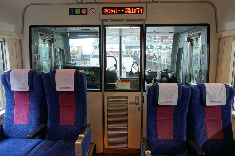 そして高松方平屋部に設けられているのが展望グリーン席です。わずか4席のみの設定で、瀬戸大橋上などの特徴ある区間を前面と側面の両方から景色を堪能できるお勧めの座席です。マルス上では「マリン・パノラマ〇〇号」と別列車扱いで収容されているので窓口で予約する際は注意が必要です。