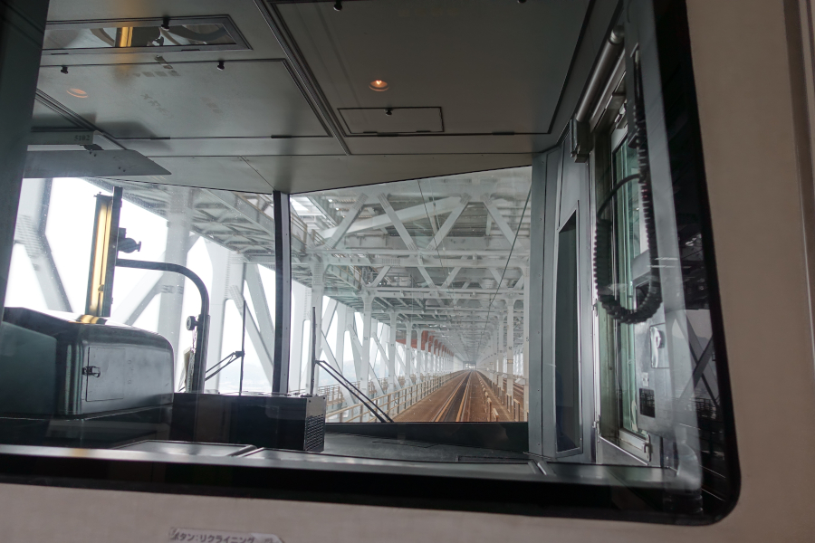 瀬戸大橋を走行中の様子です。座席が低い右側席でも前面展望には影響ありませんでした。むしろ相席になっていた左側席よりも快適なくらいでした。高松行のマリンライナーを利用する際にはぜひ座りたい特等席です。
