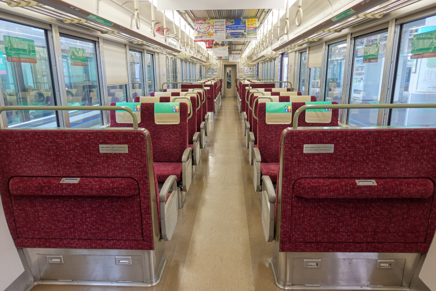 普通車はJR西日本の223系5000番台とほぼ共通の設計で、座席モケットの色が異なる程度です。一部のドア横スペースには補助席が設けられています。