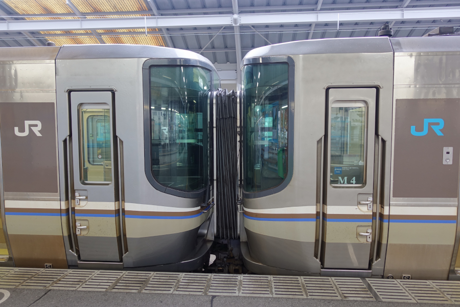 マリンライナーはJR四国所有の5000系3両にJR西日本所有の223系5000番台2両を連結した5両編成が基本の構成です。画像でを見るとJRマークの色が異なっているので所属が分かります。なお朝夕の時間帯は更に増結した7両編成や、それぞれの編成の単独運転もあります。