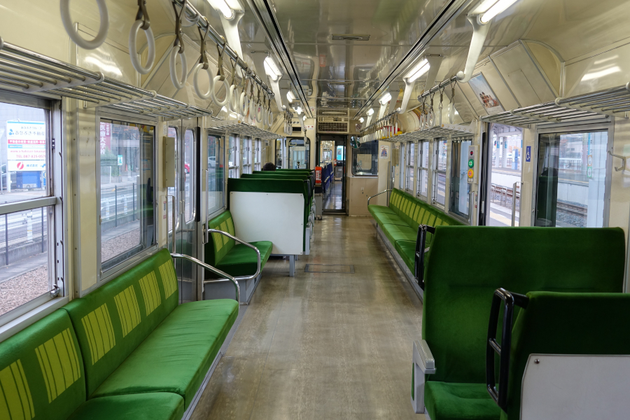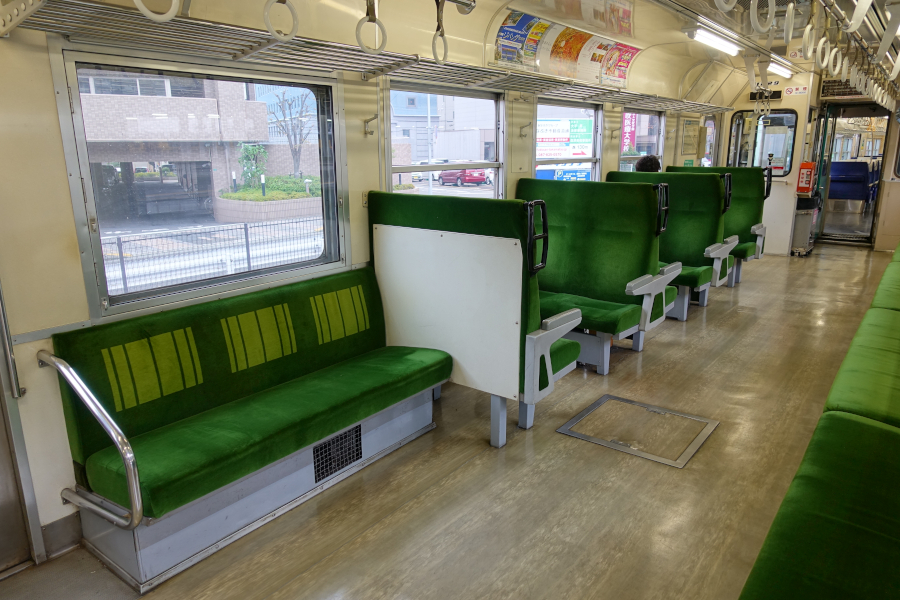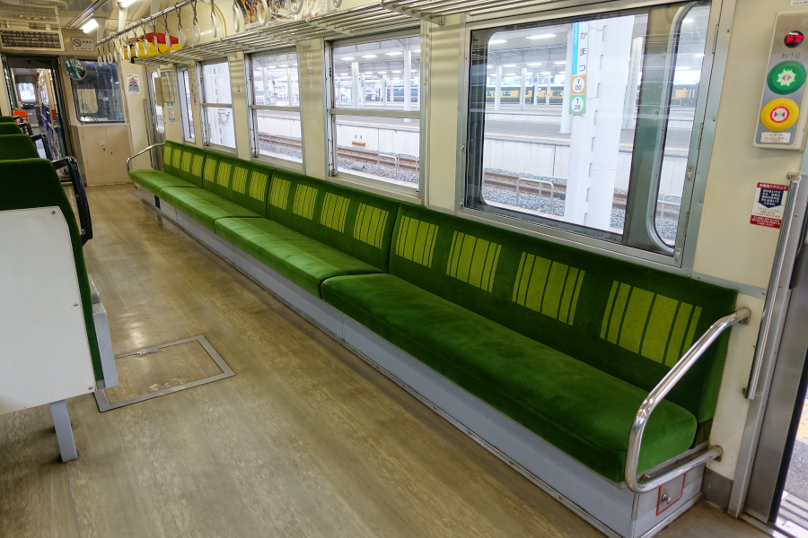 車内はロングシートとセミクロスシートの千鳥配置という独特の構成になっています。客用扉は片側3ドアですが、両端が片開き、中央が両開きというこちらも独特の構成です。