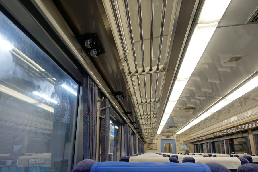 側窓上部の荷棚付近には観光バスで見かけるような空調吹き出し口が設けられています。