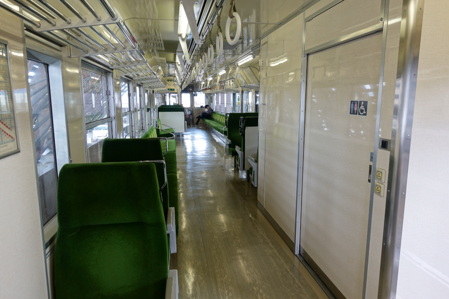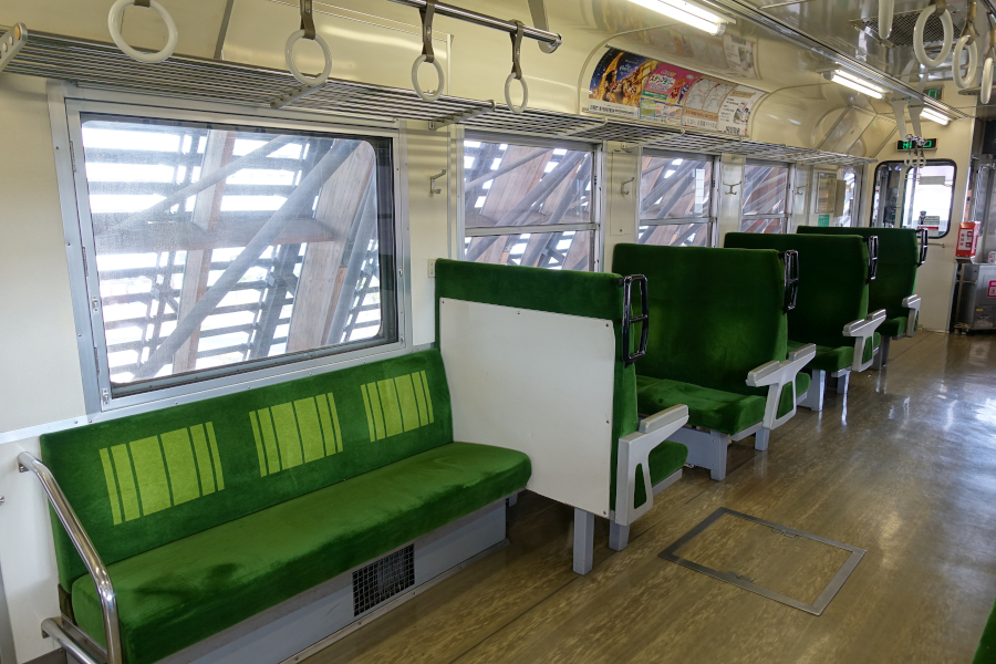 車内はロングシートとセミクロスシートの千鳥配置となっています。右側のトイレは追加で設置されました。
