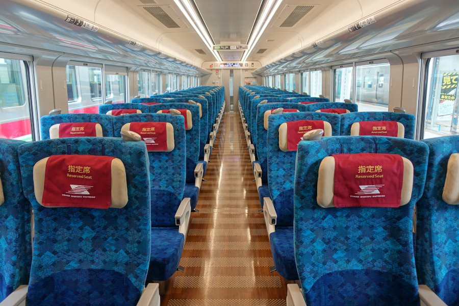 客室は間接LED照明で明るく快適です。荷棚は航空機の機内持ち込み可能手荷物サイズに対応しています。画像手前から車内の半分は指定席なので、枕カバーは指定席と書かれた赤いものが装着されています。