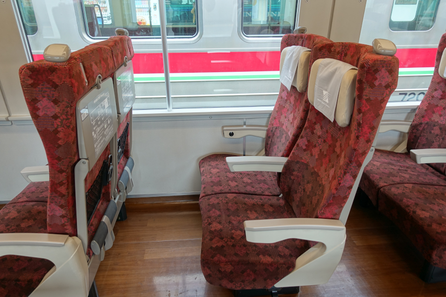高松方車両は赤系の座席モケットになっています。なお画像左手前は車椅子スペースがあるので、直後の座席は向きによっては背面テーブルが使えません。それを補うために中央の肘掛けにインアーム式テーブルが内蔵されています。