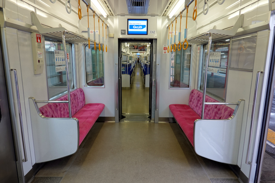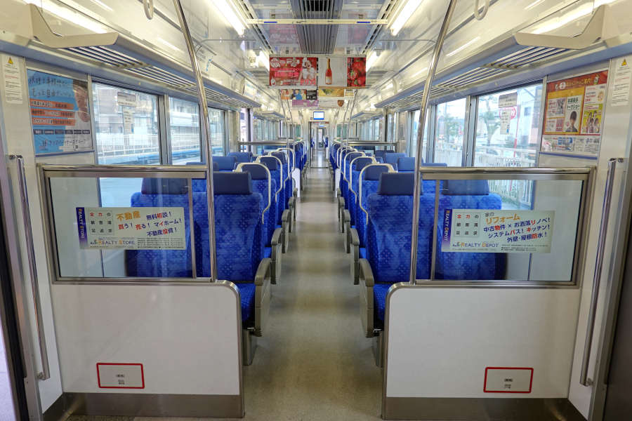 対して車端部はロングシートとなっています。細長い妻窓と貫通路上に設けられたLCDが特徴です。