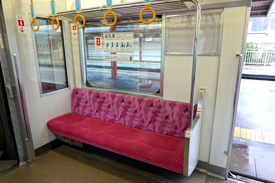 座席はバケットタイプで4人掛けとなっています。一般席は青系のモケットでしたが、優先席は赤系のモケットとなっています。