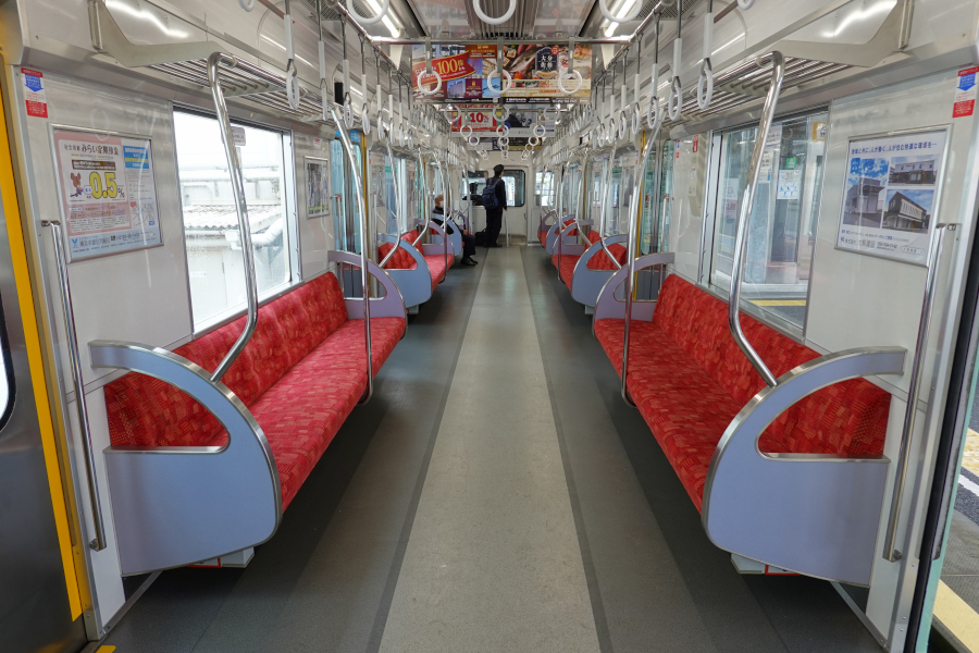 車内はロングシートが並ぶシンプルな内装です。袖仕切りは小型のものが採用されていますが、中央がくり抜かれた独特の形状です。