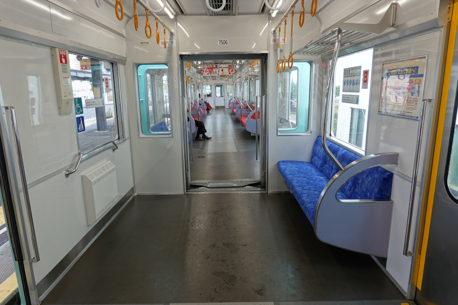 旧型車置き換えのために導入されたワンマン運転対応車両が7000形です。片側4ドアとなっていますが、ワンマン運転時は中央の2か所は締め切りとなります。両側の前面窓がパノラミックウインドウとなっている点が特徴です。